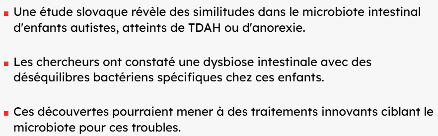 En effet, les chercheurs ont observé que des enfants atteints d’autisme, de TDAH et d’anorexie présentent des similitudes dans la composition de leur flore intestinale, caractérisée par un déséquilibre appelé dysbiose.